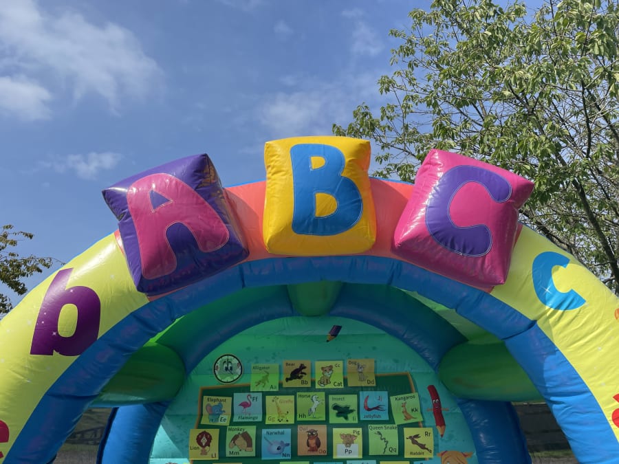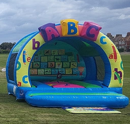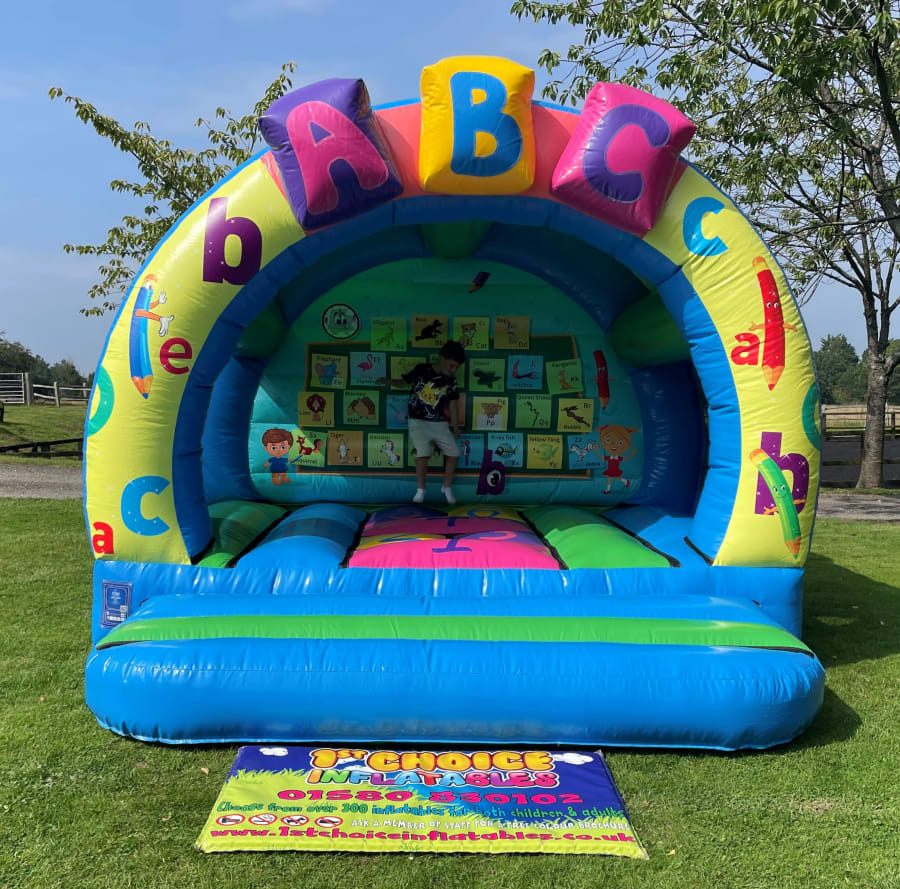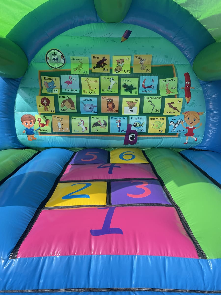 This Inflatable has Inflatable hop-scotch on the bed and letters on the back wall!