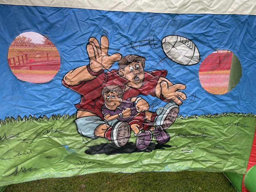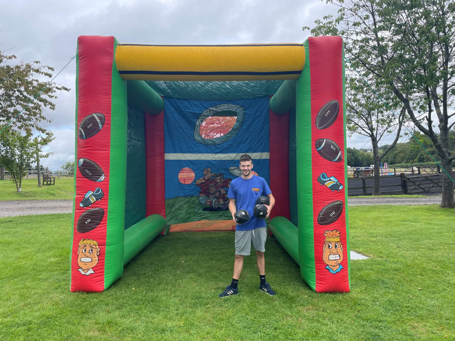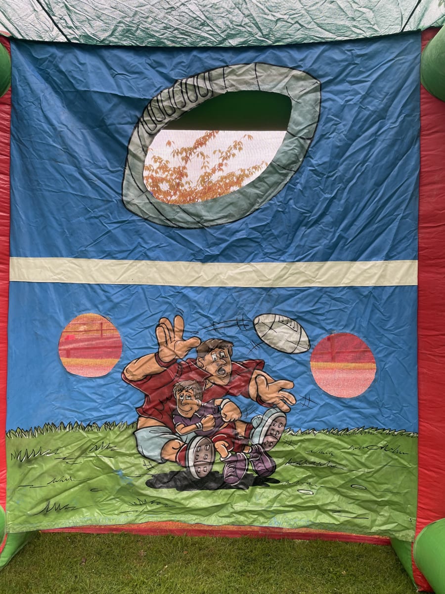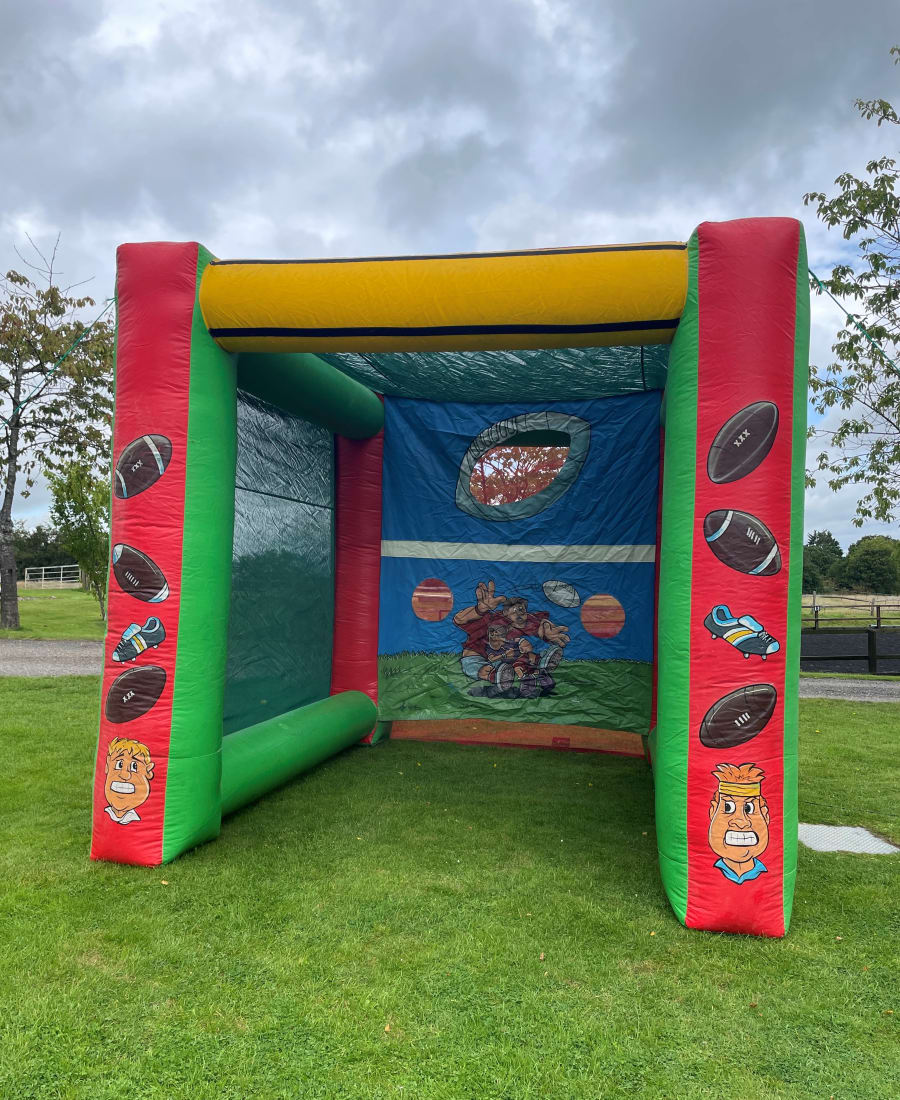 This Inflatable is a target game, the object of the game is to throw or kick a rugby ball (included) into the scoring holes!