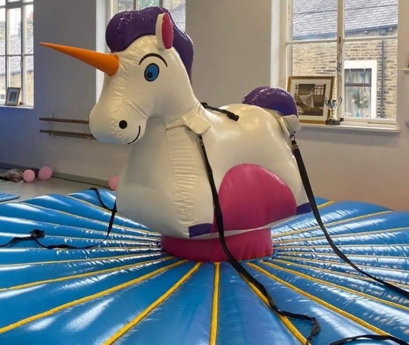 The object of the game is to rock and pull the rider by tugging the ropes on the corners of the Unicorn to get the rider to fall off onto the inflatable bed, great fun for all!